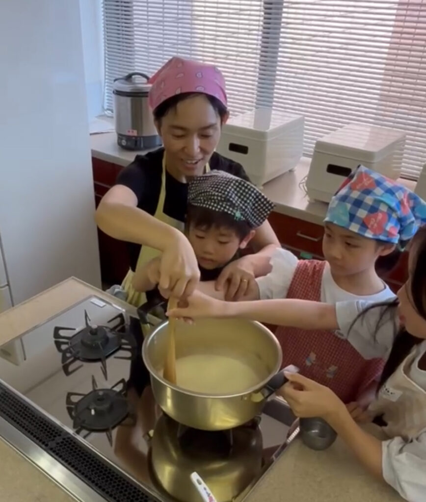 とみんなでまぜると不思議と豆乳がゆっくり固まりはじめます。
